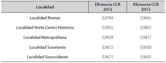 Conclusión. : Se evaluó la eficiencia considerando el modelo DEA CCR-O con retornos a escala constantes. El análisis de la eficiencia se efectuó teniendo en cuenta las cinco localidades del distrito de Barranquilla (Riomar, Norte-Centro Histórico, Metropolitana, Suroriente y Suroccidente) y se generaron los valores de eficiencia para los años 2012 y 2013.