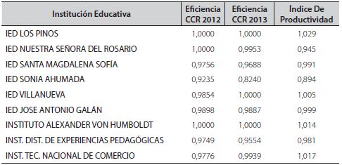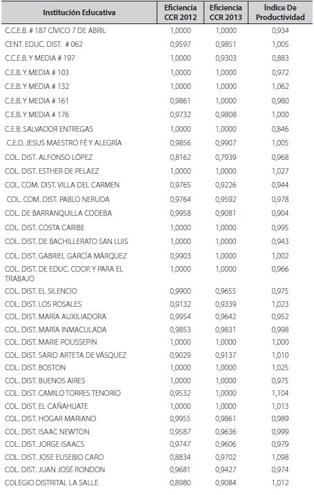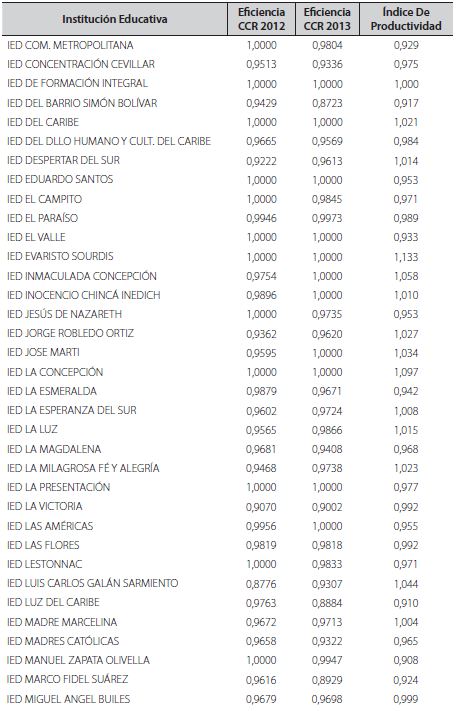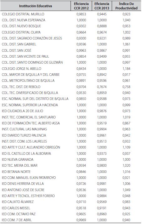 La eficiencia de las IED durante los años 2012 y 2013 es muy similar. De las 148 IED, durante los años 2012 y 2013 resultaron eficientes 54 IED y 57 IED respectivamente. Se encontró una disminución de la productividad del sector; sin embargo, 56 instituciones presentaron un IPM0 > 1, así: 1 IED de la localidad Riomar, 10 IED de la localidad Norte-centro histórico, 9 IED de la localidad Metropolitana, 12 IED de la localidad Suroriente y 24 de localidad Suroccidente. La localidad Norte-centro histórico fue la única que presentó incremento de productividad.