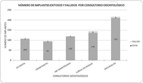 El total de implantes realizados por los consultorios odontológicos que participaron en el estudio es de 683 de los cuales fueron exitosos 663, que corresponden al 97,1%; los 20 fallidos corresponden al 2,9%. La Tabla 1 muestra los implantes exitosos y fallidos clasificados por los diferentes consultorios.