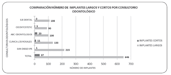En el Gráfico 2, se evidencia que los diferentes consultorios optan principalmente por el uso de implantes largos, así que es evidente la prevalencia por los implantes de este tipo, dado que 646 casos, correspondientes al 94,6%, tenían como longitud mayor o igual a 10 mm o más; mientras que solo 37 implantes, equivalentes al 5,4%, presentaban longitud menor de 10 mm.