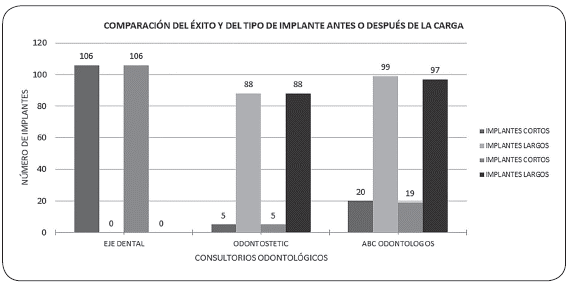 En el estudio se determinó el éxito del procedimiento de implanto logia oral, que se puede clasificar en antes o después de la carga, al igual que con la longitud del implante. El grafico 3 muestra los resultados concernientes solamente a tres laboratorios, ya que estos fueron los que aportaron esta información, los demás consultorios no tenían especificado este ítem en sus historias clínicas.