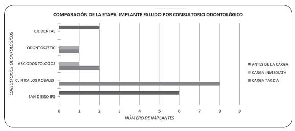 En el gráfico 1 se puede notar el número de implantes por consultorios, así como la cantidad de implantes exitosos y fallidos de cada uno de los consultorios odontológicos pertenecientes al estudio. Allí, se evidencia el bajo porcentaje de implantes fallidos; sin embargo, cabe resaltar que ninguno de los consultorios tiene una efectividad del 100% en este tipo de procesos.