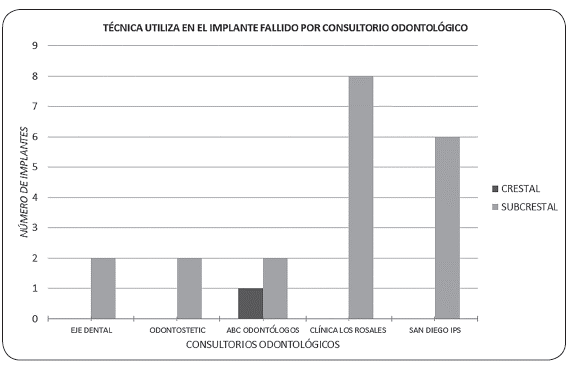 La implantología oral ha revolucionado la práctica odontológica y ha tenido un rápido desarrollo. Después de la evidencia científica de la posibilidad con éxito de la utilización de los implantes y del conocimiento de los fenómenos biológicos de la oseointegración, la tendencia ha sido hacia la integración simplificada de la técnica quirúrgica 20. Estos procedimientos se pueden dividir en técnica crestal y técnica subcrestal. Se determinó en el estudio la técnica realizada en el implante fallido (datos representados en el Gráfico 5). Es evidente que en los implantes fallidos la técnica más utilizada en cada uno de los consultorios es la subcrestal.