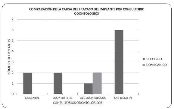 De los pacientes con implantes considerados fallidos, se establecieron las causas del fracaso. Por esta razón, se clasificaron como motivos biológicos y motivos biomecánicos. Los resultados por consultorio se muestran en el Gráfico 6, donde se nota que, principalmente, los implantes fallidos son por motivos biológicos, dado que 11 fueron por este motivo, mientras que solo fueron 2 por motivos biomecánicos.
