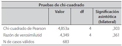 Para el análisis estadístico, se formuló la prueba de Chi cuadrado de Pearson (X2) (Tabla 1) cuyo fin es hacer un contraste estadístico de la relación de dependencia de las variables cualitativas del consultorio y éxito o fracaso en los implantes. Se determinó trabajar con un intervalo de confianza de 95%, es decir, el α=0,05, el valor de chi-cuadrado es 4,853; el grado de significancia es p=0,303; como p>0,05, se considera que no hay relación entre el consultorio y el éxito o fracaso del implante.