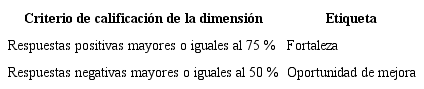 La tabla 3 muestra el resultado de las 12 dimensiones, valoradas de acuerdo con el porcentaje de respuestas positivas.
