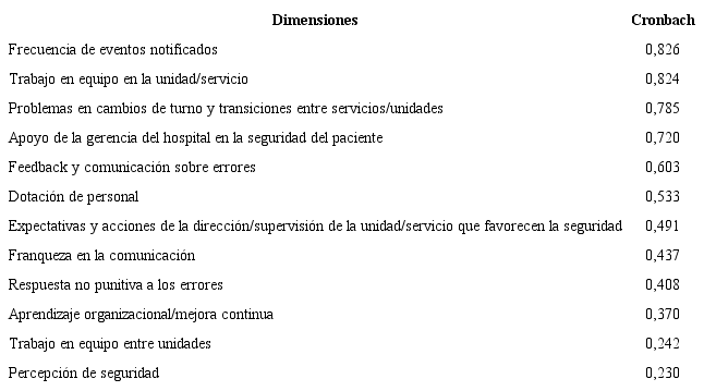 Para analizar la confiabilidad de la investigación, se realizó el cálculo del coeficiente de Alfa de Cronbach. Como se puede observar en la tabla 2, las dimensiones que obtuvieron un mayor coeficiente fueron: frecuencia de eventos notificados, trabajo en equipo en la unidad/ servicio y problemas en cambios de turno y transiciones entre servicios/unidades.