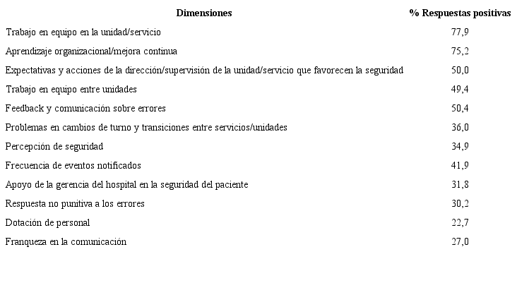 En esta investigación los hallazgos son similares a otros estudios 8-14 realizados en diferentes países y utilizando diferentes instrumentos para medir la cultura o el clima de seguridad del paciente, donde las dimensiones que constituían las fortalezas y oportunidades de mejora obtuvieron valoraciones similares.