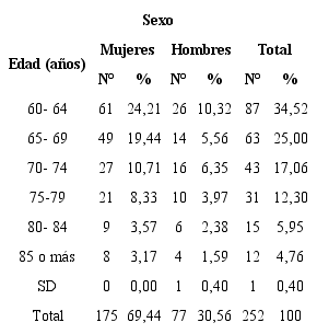 Para el análisis de Chi-cuadrado y el OR se recodificó la variable de: estrato socioeconómico como: estratos bajos para los estratos 1, 2 y 3, en donde 1 es el menor y estratos altos son 4, 5 y 6, donde 6 es el más alto. La variable de ocupación se recodificó para la permanencia de oficios o actividades dentro o fuera de la casa como: permanece en el hogar y no permanece en el hogar. Dado que existe una discusión legal en Colombia por la edad en la que se considera al adulto mayor en el grupo de la tercera edad 27, el recorrido de la muestra se utilizó para seleccionar la edad de análisis y se recodificó como: iguales o menores de 63 años e iguales o mayores de 64 años; el estado civil fue recodificado como: vive en pareja y no vive en pareja.