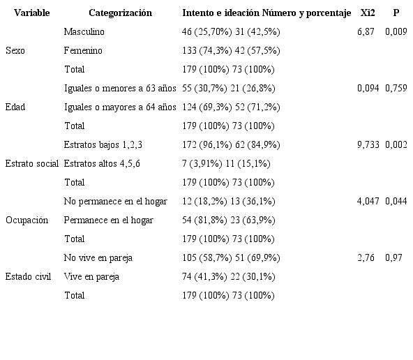 Conclusiones.: Se encontró significancia estadística para ideación e intento suicida en el adulto mayor en relación con estudio y sexo P = 0,009; estrato bajo P = 0,002 y ocupación P = 0,044. Existe 4,35 veces mayor riesgo de intento e ideación en estratos socioeconómicos bajos respecto a los altos. Las actividades fuera del hogar y vivir en pareja se identifican como factor protector.