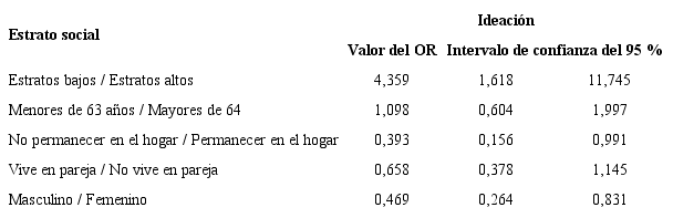 Para el riesgo (OR) los resultados arrojaron un riesgo 4,4 veces mayor de presentar intento e ideación suicida en personas que viven en estratos de bajos niveles socioeconómicos 1, 2 y 3, respecto a estratos altos 4, 5 y 6 (OR = 4,359, IC de 95%, 1,618 - 11,745). Los datos también indican que existe un ligero efecto protector cuando el adulto mayor tiene actividades fuera del hogar respecto a permanecer en el hogar (OR= 0,393, IC de 95%, 0,156 - 0,991). Así mismo, para este grupo etario se identificó la ideación y el intento suicida como factor protector; desde una perspectiva de género, del sexo masculino (OR = 0,469, IC de 95%, 0,246 - 0,831). Estos datos se muestran contrarios a lo que reporta la literatura y podrían indicar que los hombres actúan de manera contundente al consumar el intento de suicidio. Las variables de vivir en pareja y de edad no presentaron resultados significativos (tabla 3).