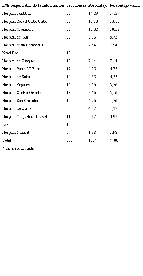 Respecto al aseguramiento en salud, la población adulta mayor que presentó intento o ideación suicida en una proporción mayor pertenecen al régimen subsidiado 49,60% (N = 125), seguido del contributivo 42,06% (N = 106) y 4,37% clasificados como vinculados. (N = 11). La ESE de la cuidad de Bogotá que más reportó eventos de ideación e intento suicida en el periodo analizado fue el Hospital Fontibón con un 14,29% de los eventos; seguida del Hospital Rafael Uribe Uribe con un 13,10% y el Hospital Chapinero con 10,32% (tabla 4).