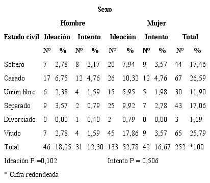 En cuanto al estado civil, en los hombres casados se presenta el mayor porcentaje tanto para ideación como para intento con 6,75% (N = 17) y 4,76% (N = 12) respectivamente. En las mujeres se presenta más ideación suicida en las viudas con el 17,86% (N = 45), los intentos en las casadas con 4,76% (N = 12) (tabla 5).