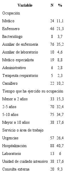 En el pre-test participaron 442 trabajadores de la institución de salud objeto de estudio, de los cuales 216 participaron en los dos módulos de la intervención educativa. De los 216 trabajadores, 40 (18,5%) fueron hombres y 176 (81,5%) mujeres, 112 (51,9%) tenían 79 (36,6%) universitario y 25 (11,6%) de posgrado. En la tabla 1 se describen un nivel educativo de técnico/tecnólogo, algunas variables ocupacionales de los participantes
