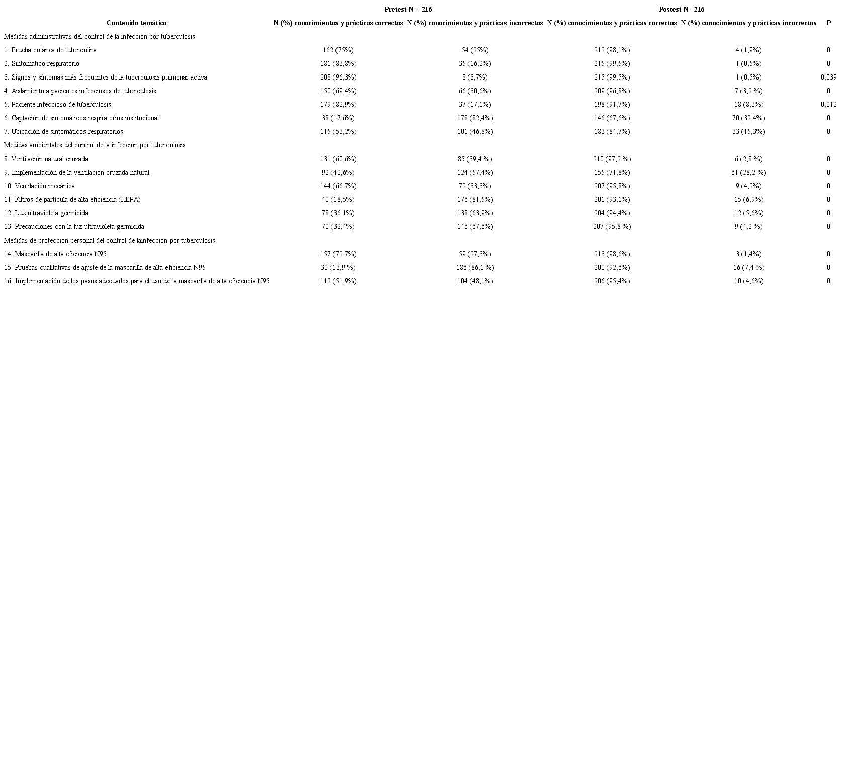 Resultados: Participaron 216 trabajadores de la salud. Se encontró un aumento significativo después de la intervención educativa sobre los conocimientos y las prácticas de las medidas de control de tuberculosis en aspectos como la prueba de tuberculina (P < 0,05), la captación de sintomáticos respiratorios (P < 0,05), ventilación natural cruzada (P < 0,05), ventilación mecánica (P < 0,05), mascarilla de alta eficiencia N95 (P < 0,05) y la implementación de los pasos adecuados para usar este elemento de protección personal (P < 0,05).