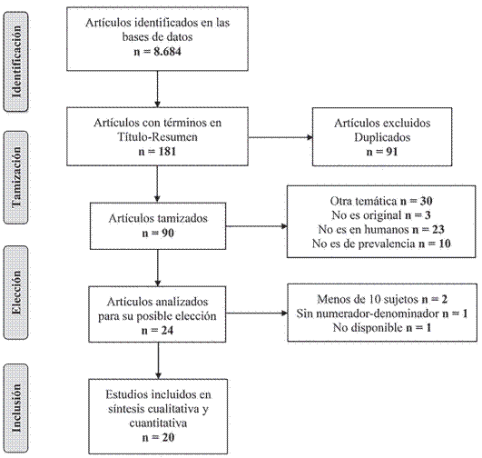 Artículos de investigación originales publicados en Medline-PubMed (base de datos interdisciplinaria de la Biblioteca Nacional de Medicina de los Estados Unidos con más de 14 millones de referencias de artículos biomédicos desde 1950), ScienceDirect (colección electrónica más grande del mundo) y Scielo (interdisciplinaria y recoge publicaciones científicas de la comunidad de habla hispana y Latinoamérica). La identificación de los términos de búsqueda se hizo con dos estrategias, consultando los sinónimos de prevalencia y parásitos intestinales en el lenguaje controlado de los tesauros DeCS (Descriptores en Ciencias de la Salud) y MeSH (Medical Subject Headings) y por una cosecha de perlas o bola de nieve, combinando las etapas del método tradicional y el método exhaustivo, esto es, identificar revisiones u otros artículos del tema central, seleccionar los términos clave para su indexación, buscar otros artículos relevantes con los nuevos términos, seleccionar las bases de datos y repetir este proceso en cada nueva base de datos hasta no hallar nuevos términos.