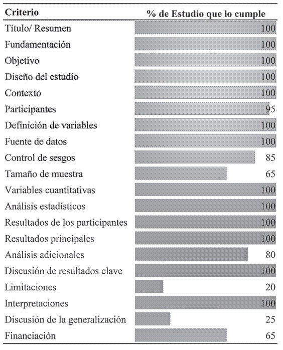 La calidad metodológica fue buena en la medida en que la mayoría de estudios cumplió más de un 70% de los criterios de la guía Strobe; sin embargo, lo referido a la declaración de las limitaciones y la discusión de las posibilidades de generalización de los resultados fue aplicado en una baja proporción de estudios (figura 2).