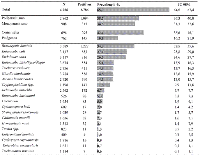 La población de estudio estuvo conformada por 4.226 sujetos, entre los estudios que describen sus poblaciones de estudio según el sexo, el 46,0% (n = 1.281) fueron mujeres y el 54,0% (n = 1.502) hombres. La prevalencia general de parasitismo fue de 65,9% (IC de 95% = 64,5 - 67,4), con una elevada prevalencia de infección por dos o más parásitos simultáneamente (poliparasitismo, independiente si es o no patógeno) y por especies comensales. Las infecciones más prevalentes corresponden a Blastocystis hominis, E. coli, E. nana y E. histolytica/dispar/moshkovski; mientras que las especies de menor magnitud fueron E. hominis, C. cayatenensis, E. vermicularis y T. hominis (figura 3).