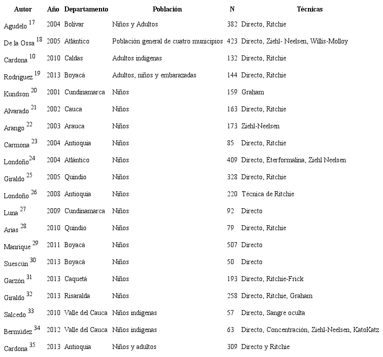 Los estudios se publicaron entre 2004 y 2013, los departamentos con mayor proporción de estudios fueron Antioquia y Boyacá con un 15%. 85% de los estudios incluyeron niños, el 15% se realizó en indígenas, las principales técnicas diagnósticas fueron el coprológico directo usado en el 85% de las publicaciones, seguido de métodos de concentración (tabla 1).