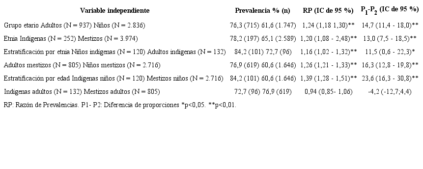 La prevalencia de infección fue un 14,7% mayor en los adultos frente a los niños; sin embargo, al estratificar los análisis según la etnia este comportamiento solo se conservó en los mestizos (prevalencia de un 16,3% mayor en los adultos), mientras que en los indígenas se invirtió con una prevalencia de un 11,5% mayor en los niños. Por su parte, la prevalencia de infección fue 13,0% mayor en los indígenas; al estratificar por el grupo etario el comportamiento de la infección cambió significativamente, en la medida en que la infección resultó 23,6% mayor en niños indígenas en comparación con los niños mestizos, mientras que en los adultos no se registraron diferencias estadísticas según la etnia (tabla 2).