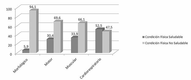 El proceso consistió en recodificar en variables dummy (saludable y no saludable), el baremo establecido por el protocolo Alpha Fitness se consideró saludable en el nivel moderado en las tres pruebas que integran el componente morfológico; por su parte, para las pruebas que establecen el componente 122 muscular y cardiorrespiratorio se consideró como saludable los niveles moderado, alto y muy alto; finalmente para el componente motor se determinaron como saludables los niveles moderado, bajo y muy bajo. Una vez recodificada la condición física por componentes se prosiguió a realizar una sumatoria de cada uno de estos, seguidamente, los autores establecen que un escolar al presentar uno o ningún componente no saludable, este debía ser catalogado con condición física saludable, pues Moro, et al. 34 menciona que la condición física es saludable siempre y cuando el sujeto evaluado presente buen desempeño en cuatro de los cinco componentes de la condición física relacionada con la salud.