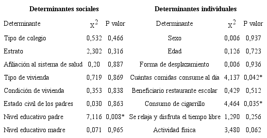 Los resultados del análisis bivariado muestran que la condición física saludable tiene relación de dependencia con el número de comidas al día (p = 0,042), el nivel educativo del padre (p = 0,035) y el consumo de cigarrillos (p = 0,008), observándose que el 76,2% de los alumnos que mencionaron técnico, tecnológico y universitario como nivel educativo del padre obtuvieron una condición física no saludable, al igual que el 80% de los escolares que mencionaron consumir cigarrillo o consumir más de tres comidas al día.