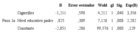 Finalmente, al ingresar estas variables al modelo logístico binario realizado, las únicas que mostraron ser predictoras de la variable dependiente condición física son: el nivel educativo del padre y el consumo de cigarrillo.