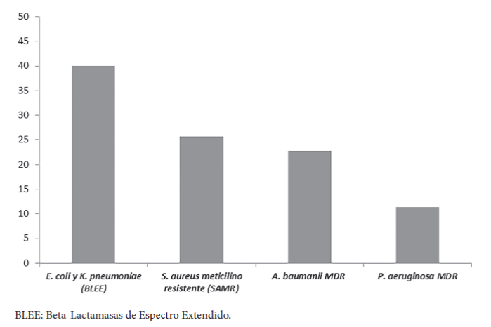 El 23,6% (n = 35) de todos los pacientes presentaban infecciones con bacterias con perfiles amplios de resistencia, incluidos E. coli y K. pneumoniae productores de BLEE en un 40%, SARM 25,7%, A. baumanii MDR 22,8% y P. aureginosa MDR 11,4%. Se definieron las categorías de MDR de acuerdo a la clasificación propuesta por Magiorakos, et al. 18, donde un microorganismo se caracteriza por ser resistente a por lo menos un antibiótico en más de tres categorías de medicamentos, los cuales incluyen amino-glucósidos, carbapenémicos, cefamicinas, fluoroquinolonas, inhibidores de la síntesis del folato, etcétera. Para el caso puntual de S. aureus, este se considera como MDR por ser meticilino-resistente o tener resistencia a más de un antimicrobiano en más de tres categorías de medicamentos, al igual que las enterobacterias 18.