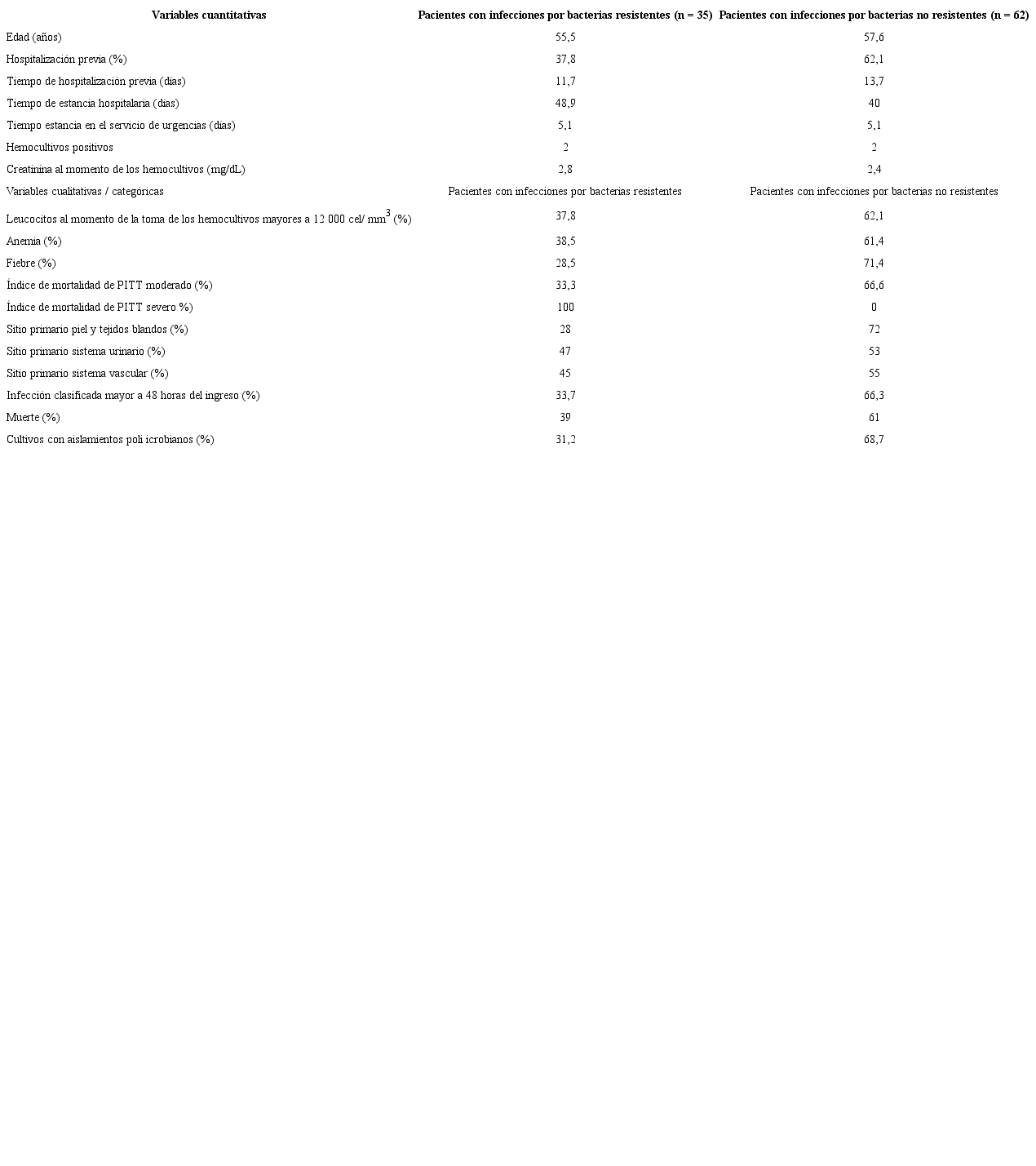 Se midieron importantes variables clínicas y de laboratorio para el desenlace de interés, para las variables cuantitativas de laboratorio se realizó una prueba de ShapiroWilk, con el fin de determinar su distribución normal, con expresión en medias y rangos intercuartílicos. Las variables cualitativas se expresaron en porcentajes, se realizaron comparaciones de proporciones entre el grupo de pacientes con aislamientos resistentes y aquellos con aislamientos no resistentes.
