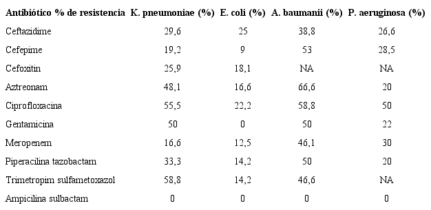 Conclusión.: El 23,6% de los pacientes tenía una infección por gérmenes resistentes, los más comunes fueron E. coli y K. pneumoniae, la mortalidad general fue del 30%.