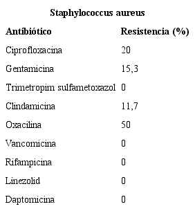 Resultados: foram analisados 148 prontuários; a idade média foi de 55,5 anos; 51,4 % eram mulheres. A proporção de germens resistentes foi de 23,6 %; a produção de beta-lactamasas de espectro estendido em E. coli e K. pneumoniae foi de 40%. 100% dos pacientes com germens resistentes tinham um índice de PITT severo. O S. aureus mostrou 50% de resistência à oxacilina.