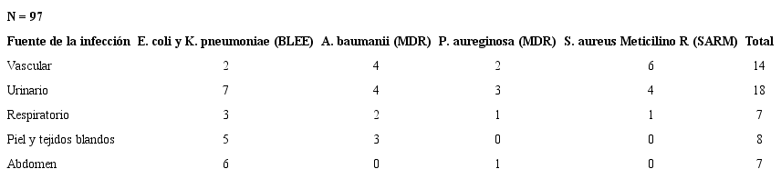Al tener en cuenta que los pacientes fueron atendidos en un servicio de medicina interna y la diversidad de sus patologías, se presentan en la tabla 4 los sitios anatómicos fuentes de la infección más frecuentemente documentados y los hallazgos con respecto al aislamiento de bacterias resistentes, teniendo en cuenta que un paciente podía tener más de un sitio anatómico como fuente de infección o aislamiento del mismo microorganismo en más de un sitio.