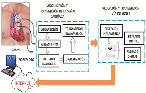 Para esta fase se elaboró inicialmente un diagrama de bloques donde se proyectó el comportamiento del dispositivo ya terminado, en la figura 2 se observa el diagrama de bloques de funcionamiento del prototipo. Se concibió un prototipo de monitoreo cardíaco ambulatorio utilizando componentes de bajo consumo de potencia; el dispositivo diseñado captura las señales eléctricas del corazón y las envía a un servidor remoto por medio de la tecnología inalámbrica Zigbee, lo que garantiza un monitoreo constante que hace uso de internet, la información capturada es enviada de forma continua o en periodos de tiempos configurables definidos según el criterio del médico especialista.