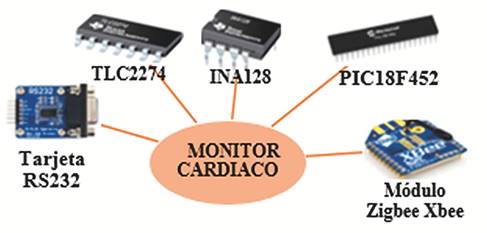 Para la adquisición, el procesamiento y la visualización de la señal ECG se utilizó el software Labview, ya que ofrece bibliotecas integradas para análisis avanzado y visualización de datos y facilita la creación de instrumentación virtual, con el que se aprovechan funciones específicas para ingeniería como son análisis de frecuencia, ajuste de curvas, filtrado, entre otras; además de realizar análisis en línea en tiempo real en señales adquiridas. El dispositivo diseñado plasma como lineamientos la miniaturización en conjunto con la portabilidad, ya que la señal ECG no es almacenada, sino que es transmitida después que ha sido filtrada y digitalizada. En la figura 3 se puede apreciar un conjunto de los componentes más relevantes utilizados en la construcción del prototipo.