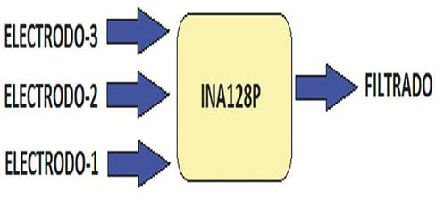 Para obtener la señal del EKG y realizar un prototipo de bajo costo se utilizaron electrodos de superficie, ya que son más económicos que los de inserción y brindan comodidad al paciente (Electromedicina, 2011). Se deben ubicar unos electrodos en puntos estratégicos del cuerpo según la derivación electrocardiográfica que se seleccione, los cuales captarán impulsos eléctricos que deben ser amplificados por su baja intensidad. Para este fin se seleccionó el amplificador de instrumentación INA128, por su alto rechazo al modo común (CMR - 120dB), de propósito general y bajo consumo de energía que ofrece excelentes características.