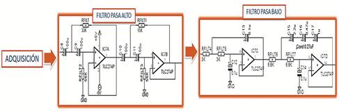 Después de adquirir y amplificar la señal en la etapa anterior, es necesario minimizar el ruido y las señales eléctricas indeseadas. Al tener en cuenta que solo son requeridas las componentes de señal en un rango de frecuencias comprendido entre 0,05 Hz y hasta 100 Hz, se implementó un filtrado pasa-banda constituido por un filtro pasa-altos y un filtro pasa-bajos, diseñados para el rango de frecuencias anteriormente mencionado. El amplificador operacional seleccionado para el filtrado es el cuádruple OPAM TLC2274 de Texas Instruments, cuya principal característica es ser un amplificador de bajo ruido y rail to rail, es decir que el voltaje de salida del operacional nunca alcanzara a VDD (voltaje de alimentación positiva), sino que será ligeramente inferior. Adicionalmente, proporciona un ancho de banda de 2 MHz y una corriente de polarización de entrada típica de 1 pA. En la figura 5 se aprecia un diagrama de bloques del filtro pasa-banda.