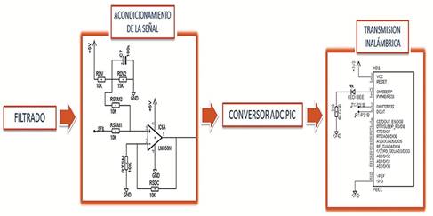 La señal cardiaca es recolectada a través de los electrodos adheridos al cuerpo del paciente, esta debe ser amplificada debido a su bajo nivel de voltaje por un amplificador de instrumentación, luego debe ser aislada eléctricamente para protección del paciente con un opto-acoplador y posteriormente realizarse un proceso de cancelación de ruidos y señales eléctricas no deseadas por medio de un filtrado pasa-banda, comprendido entre 0,05 Hz y 100 Hz, por ser este el rango en que se definen las señales EKG.