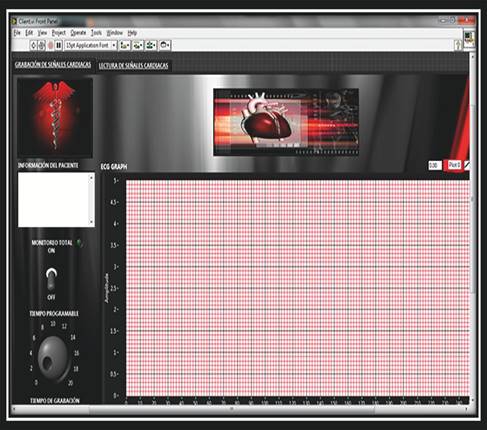 La señal adquirida es procesada digitalmente, para visualizarla se utiliza la interfaz de adquisición de datos, a su vez, esta señal está siendo almacenada y transmitida a través de internet mediante la aplicación “Cliente-Servidor”, la cual debe ser configurada para que exista comunicación y el proceso de transmisión sea satisfactorio. En las figuras 7 y 8 se puede apreciar la interfaz de la aplicación del servidor y la interfaz de la aplicación del cliente respectivamente. La figura 9 muestra la señal cardiaca en el computador local, la cual ha pasado por el proceso de adquisición, aislamiento y filtrado análogo, transmisión inalámbrica y filtrado digital. Para la correcta configuración de la aplicación se creó el manual de instrucciones para el manejo del software, de igual manera se diseñó un manual para el adecuado uso del hardware que hace parte del proyecto, se realizaron las pruebas necesarias en compañía del médico especialista para determinar la confiabilidad del sistema.
