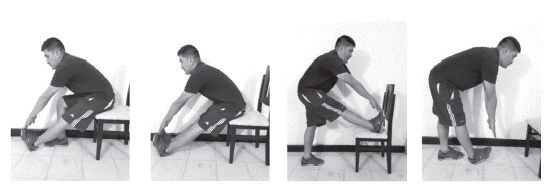 Al término de la valoración antropométrica, se procedió a realizar la evaluación de la potencia del salto en miembros inferiores a través de la plataforma de contacto Axon Jump modelo S y el programa Axon Jump versión 4.2. Previamente a los saltos, se realizó un calentamiento estandarizado durante 10 minutos que consistía en ejercicios de carrera continua, movilidad articular general, saltos y cambios de dirección. Una vez terminados los ejercicios pre-competitivos, se ejecutaron los dos saltos establecidos, el test de Squat Jump (SJ) que consistía en realizar un único salto desde los 90 grados de flexión de rodilla, manteniendo esta posición durante 3 segundos sin contramovimiento y con las manos en las caderas. Posteriormente, se ejecutó el Counter Movement Jump (CMJ). Esta prueba se hizo partiendo de una posición erguida, haciendo un movimiento de sentadilla para luego realizar la extensión de rodilla y cadera para producir el despegue de la plataforma. Para la recepción del salto, el deportista debía soportar inicialmente el peso de su cuerpo en la región metatarsiana 3. Cada uno de los deportistas realizó un solo salto por prueba a la máxima capacidad posible, en el cual se registraron los datos de altura, velocidad del salto y tiempo de vuelo de cada una de los test realizados. Después de la primera evaluación de la capacidad de salto, el deportista realizaba dos series consecutivas de cuatro ejercicios de estiramiento estático de 20 segundos; estos generaban una sensación de tensión en la musculatura isquiosural (figura 1), la posición para generar tal efecto era tocar la punta de los pies en cuatro posiciones diferentes 14. Inmediatamente se culminó la ejecución de los estiramientos estáticos para la musculatura isquiosural, se realizó nuevamente la valoración de la capacidad de salto con el SJ y CMJ. La evaluación se repitió a los 5 y 10 minutos posteriores a la finalización de los ejercicios de flexibilidad estática.