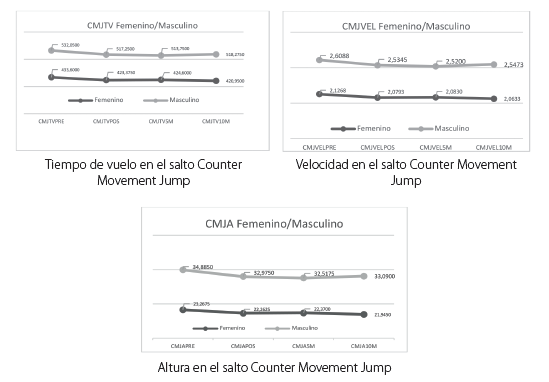 Se observó un descenso entre los promedios del pre y el post de las pruebas de salto CMJ en velocidad, altura y tiempo de vuelo (p<0,05), mas no se encontró esta diferencia en las pruebas del salto SJ (p≥0,05). En el gráfico de medias, se observa que los deportistas de sexo masculino sobre el minuto 10 posterior a los estiramientos aumentan los valores del salto en todas las pruebas (tablas 2 y 3). Se encontró una diferencia estadística inter e intragrupos (p<0,000) en todas las pruebas de salto (p<0,05) (figura 2).