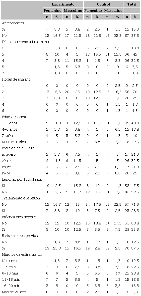 En relación con los aspectos de la práctica deportiva, se encontró que el 83,8 % (n=67) de los participantes refiere no tener antecedentes de lesiones deportivas. Quienes refieren haber sufrido una lesión por fútbol sala conforman un 47,5 % (n=38), de los cuales tan solo el 28,8 % (n=23) han recibido tratamiento. El 87,5 % (n=70) de los participantes refiere realizar estiramientos previos a la práctica, con mayor frecuencia entre 6 y 10 minutos (28,8 %) (tabla 1).