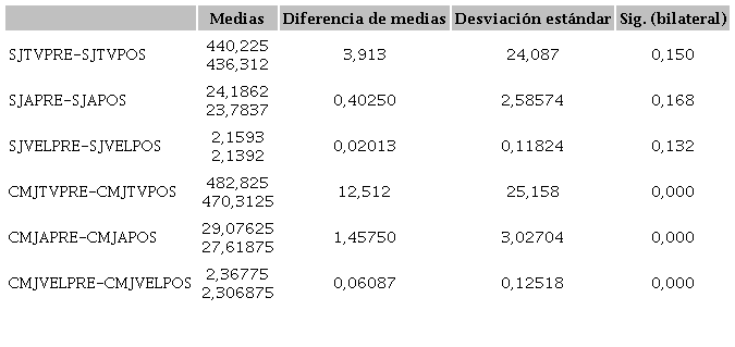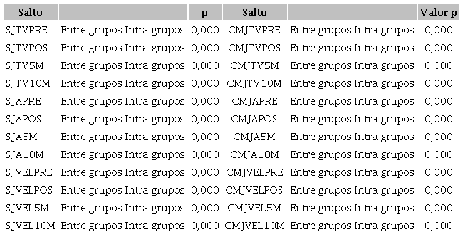 Las variables numéricas que no cumplieron requisito fueron edad, salto desde flexión de rodilla a 90° a los 10 minutos (SJV10M), salto de altura a 5 y a los 10 minutos (SJA), salto de velocidad (SJVEL) a los 5 y a los 10 minutos. Posterior a la prueba de Anova, se realizó la prueba post hoc de Scheffe para identificar en qué grupo se encontraba la diferencia.