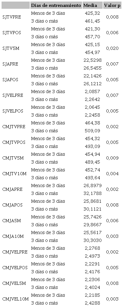 Al realizar la prueba T para muestras independientes, entre días de entreno y cada uno de los saltos en sus diferentes momentos, se encontró significancia estadística con valor de p menor de 0,05. Así mismo, se observa que los participantes que entrenaban 3 o más días mostraban medias más altas que aquellos que entrenaban menos de 3 días en todas las mediciones (tabla 4). No se encontró significancia estadística entre las diferentes pruebas de salto con horas de entreno, índice de masa corporal, edad cronológica y edad deportiva (p>0,05).