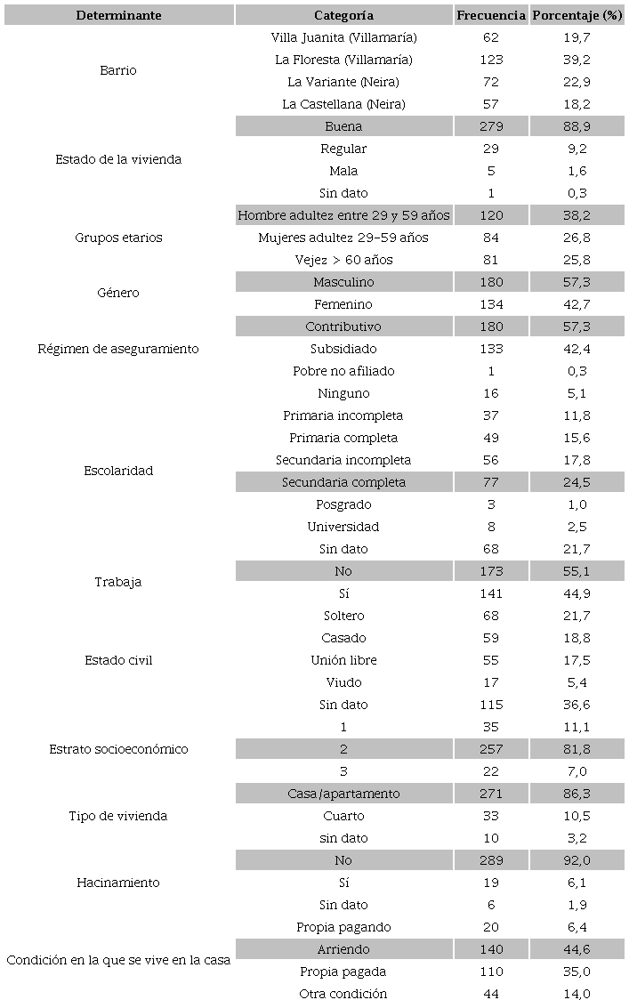 Nótese en la tabla 1 como en el Municipio de Villamaría fueron analizadas 185 fichas familiares correspondientes a los barrios La Floresta y Villa Juanita. En el municipio de Neira se analizaron 129 fichas, respectivamente. En cuanto al estado de la vivienda, el mayor porcentaje la catalogó como buena, ubicada en estrato socioeconómico 2, correspondiente a casa o apartamento en arriendo y el mayor porcentaje no viven en hacinamiento. En lo referente a la persona cabeza de hogar, en mayor porcentaje resultaron ser hombres entre 29 y 59 años, con edad promedio de 49,5 años +/- 15,8 años. Además, solo el 0,3 % de las familias de ambos municipios no se encuentra afiliada a un régimen de salud, lo cual denota buena cobertura de aseguramiento entre el régimen contributivo y el subsidiado correspondiente al 99,7 %, en el momento no trabajaban y su nivel educativo en mayor porcentaje se ubica entre secundaria incompleta y completa (tabla 1).