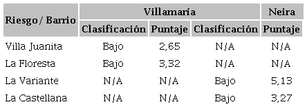 Los barrios fueron comparables entre ambos municipios según el riesgo acumulado y los que se seleccionaron fueron: en el municipio de Villamaría: La Floresta y Villa Juanita; en el municipio de Neira: La Castellana y La Variante. Para el caso de Villa Juanita del municipio de Villamaría y el barrio La Variante de Neira con 3,89 puntos promedio de riesgo; para el barrio La Floresta de Villamaría y La Castellana con 3,29 promedio de riesgo.