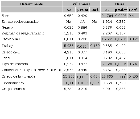 En el análisis bivariado se encontró que en el municipio de Villamaría los determinantes que presentaron asociación estadísticamente significativa p<0,05 con el riesgo familiar fueron el trabajo de la persona cabeza de hogar, el estado de la vivienda y el hacinamiento. En contraste con el municipio de Neira, los determinantes que presentaron asociación p<0,05 con el riesgo familiar fueron el barrio, la escolaridad de la persona cabeza de hogar, el tipo de vivienda y, de igual manera, el estado de esta. El coeficiente de asociación más alto fue el de tipo de vivienda 0,63, considerado como aceptable (tabla 3).