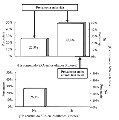 En general, la prevalencia de consuma SPA en la vida fue del 73,7 % en contraste con la prevalencia de consumo de SPA en los anteriores tres meses, del 48, de - 4% a partir del momento en que se aplicó el instrumento (figura 1).