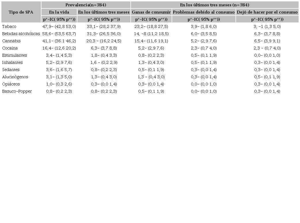 Resultados: La prevalencia de consumo de SPA en la vida fue del 73,7 % con predominio del consumo de bebidas alcohólicas 58,6 %, del tabaco, 47,9 %, cannabis, 41,1 %, y cocaína, 16,4 %. La prevalencia de consumo de SPA en los últimos tres meses fue del 48,4 %, con hegemonía del tabaquismo, 33,1 %.