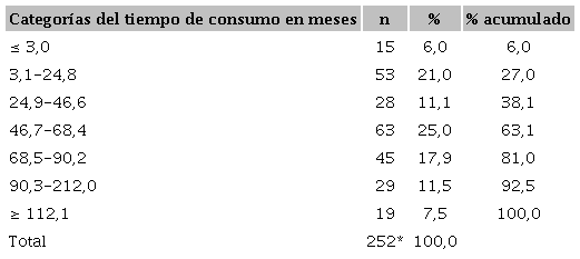 Fue importante conocer el tiempo de consumo en la vida de SPA, en meses, cuya distribución fue muy heterogénea con importantes variaciones entre los consumos mínimo y máximo. Se conoció la información de dicho tiempo de consumo en la vida en 252 soldados. El 50 % de estos refirió que ha había consumido SPA como máximo durante 49,7 meses (4,1 años); de igual manera, el tiempo de consumo más usual fue de 69,8 meses (aproximadamente 5,1 años). Nótese que el 27 % indicó que el tiempo de consumo en la vida fue como máximo de dos años y quienes respondieron que este había sido mayor de 5,7 años constituyeron el 19 % del total de soldados en la muestra (ver tabla 2).