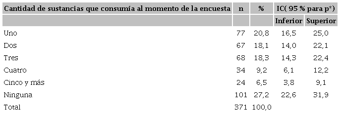 Se destaca que, en general, el 57,2 % de los soldados regulares consumían, al momento de la encuesta, máximo 3 sustancias psicoactivas. Llama la atención que el 6,5 % de los 371 soldados en quienes se conoció la cantidad de sustancias que habían consumido a lo largo de su vida refirieron que habían consumido como mínimo 5 sustancias (ver tabla 3).